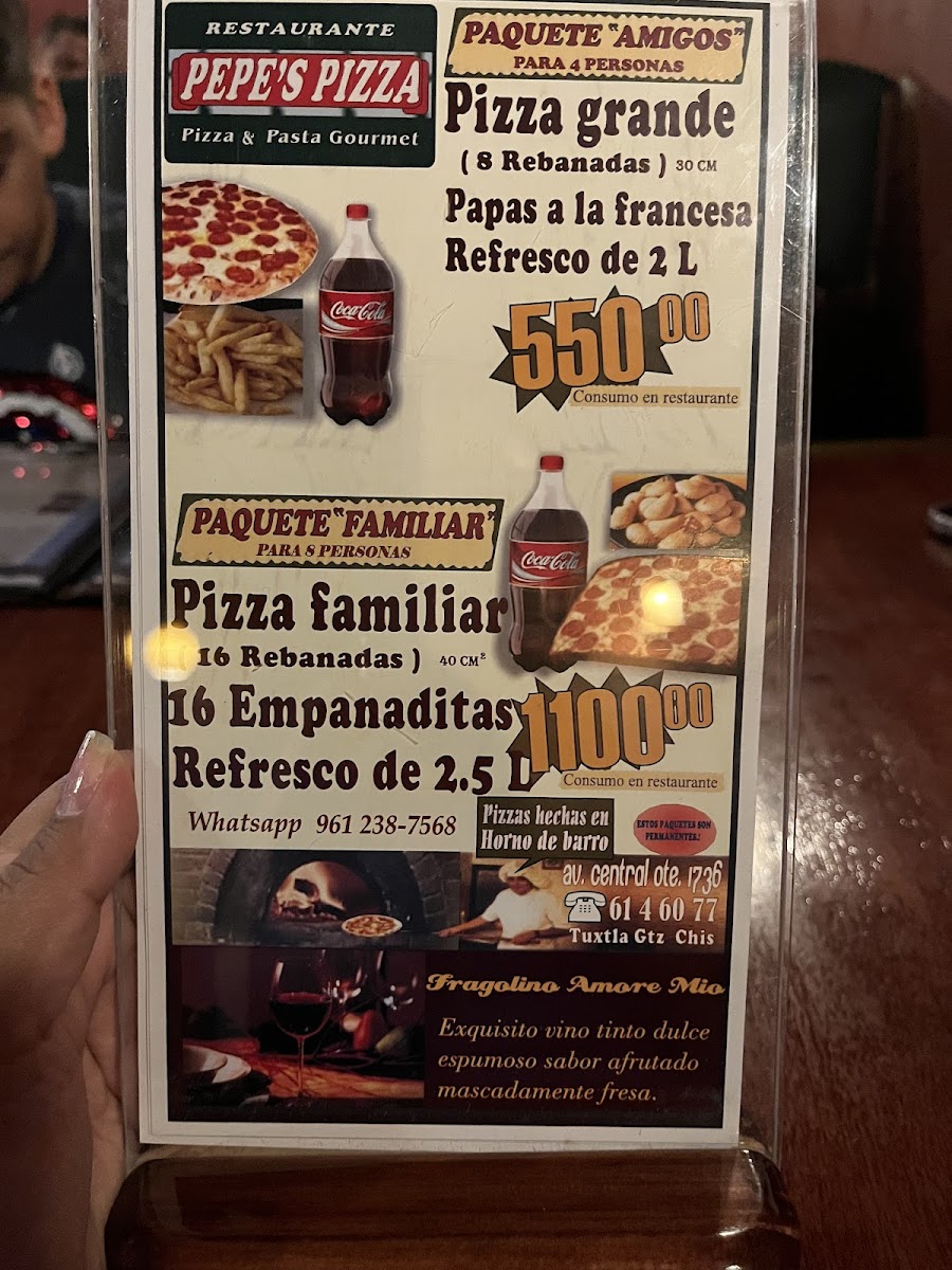Welcome to Pepe's Pizza, where you’ll find a delightful blend of traditional Italian flavors right in the heart of Tuxtla Gutiérrez. Our menu offers an array of sumptuous pizzas that are a feast for the senses, complemented by a selection of pasta for those who prefer alternatives. Customers rave about the delicious taste and the inviting atmosphere, making it a perfect spot for family outings or a casual dinner with friends.